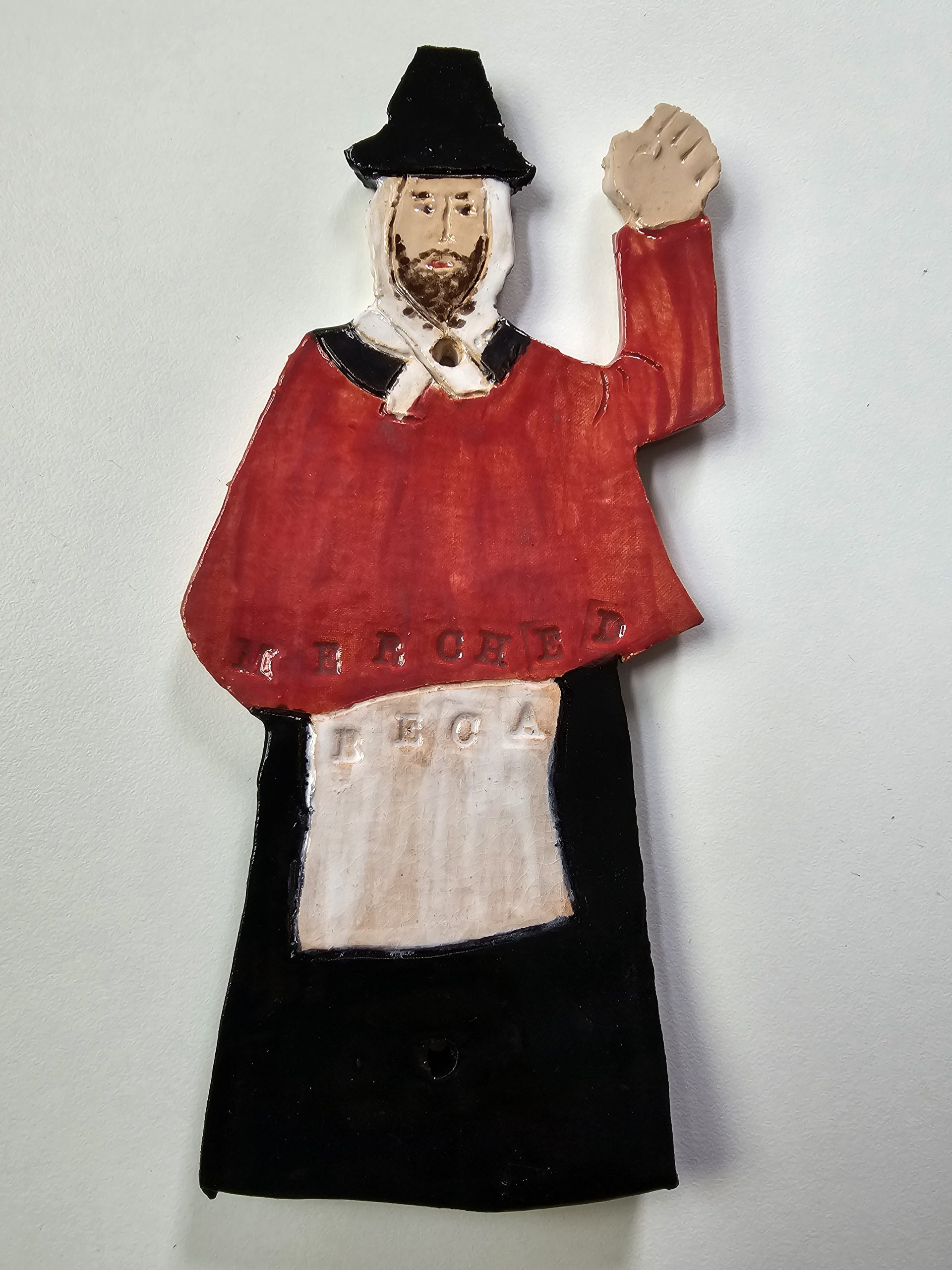 Handmade Ceramic Welsh Merched Beca, glazed and fired. Can be screwed to a mounting point (e.g. timber structures outside).